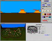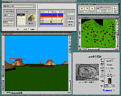 The viewer windows provide images of the village from particular positions at particular times during simulations. The viewer windows are interfaces for "walking-through" the village. The primary actions in the windows are to go forward or backward, and to turn left or right.