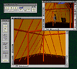 The interface between the user and the virtual world is provided by two different viewers. The first viewer, called the "Walk Viewer" (Fig. 2, bottom left), gives a perspective scene from a human model and as such is the "user's viewpoint." The second viewer, called the "Auxiliary Viewer (Aux Viewer)" (Fig. 2, middle right) provides a bird's eye view of the scene. In the "Aux Viewer", a human model (i.e., the avatar of the user) is also shown. This avatar is used as the reference of the current position and the size of the site or building.