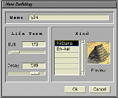 The right part of the panel is to edit the data of buildings. Building a house is done by specifying the type of building at each floor mark. For example, to add a new building, the user first selects a floor mark. The user then pushes the "Add" button to pop up the "New Building" window as shown in Fig. 5, to input the identification name, lifespan and type of building.