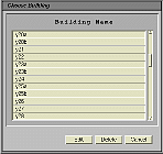 When the user wants to modify the data of an existing building, the user first pushes the "Edit" button to pop up the "Edit Building" window and then inputs new values. The "Edit Building" window has a delete button, and is different from the "New Building" window. If the user clicks the "Edit" button without specifying a building, a list window pops up as shown in Fig. 6. The user can select a building and modify the data of the building.
