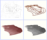 The land model consists of the terrain of the site and the sky above the virtual village. First, we input contour data obtained from a contour map like that shown in Fig. 8 (top left) and make a 3-D contour map (Fig. 8, top right). This 3-D contour map is then complemented with a surface to create a real terrain model (Fig. 8, bottom left). The sky is modeled as a texture-mapped cylinder object with a cone top, which is independent of the archaeological data but is used to provide an environmental scene.